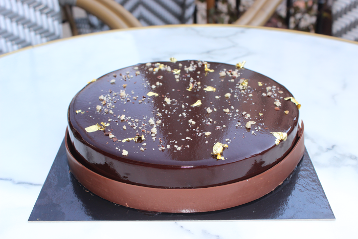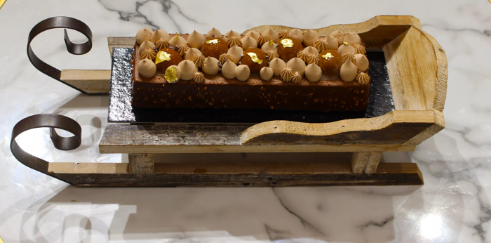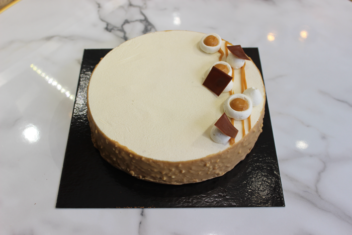 Biscuit chocolat, caramel beurre salé, bavaroise vanille, coque double caramel.