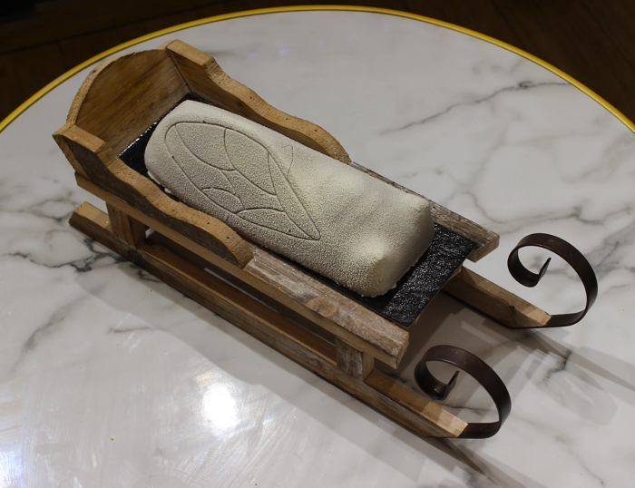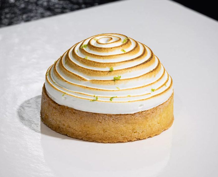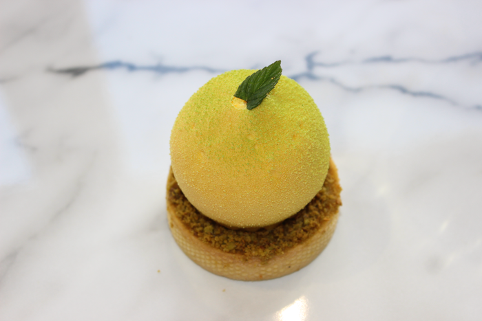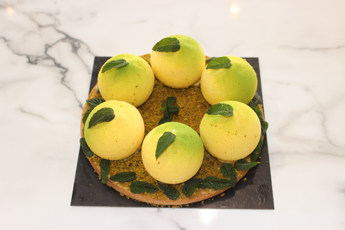 Pâte sucrée, crème d’amande au zeste de citron, crémeux citron, biscuit amandes, bavaroise menthe poivrée / huile d’olive