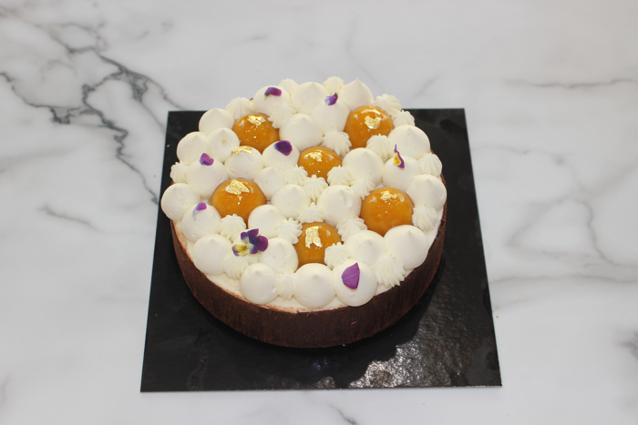 Pâte sucrée cacao, crémeux chocolat noir 66%, praliné cacahuète, ganache montée au chocolat au lait.