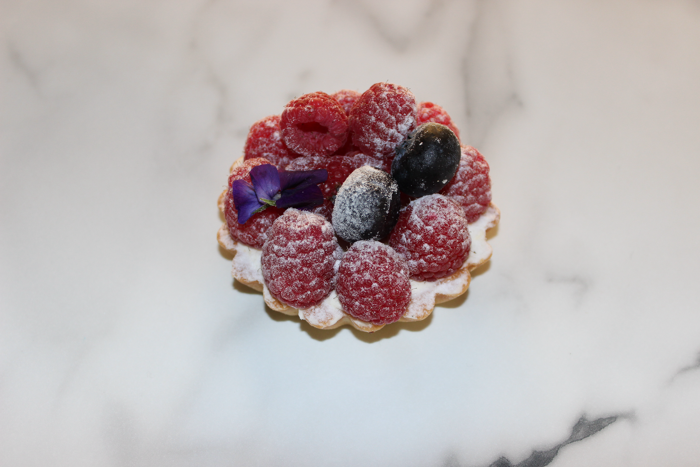 Pâte sucrée, crème d’amande, ganache montée vanille, confit fruits de saison, fruits frais de saison