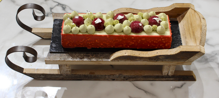 Biscuit amande, compoté framboise citron vert, mousse pistache.