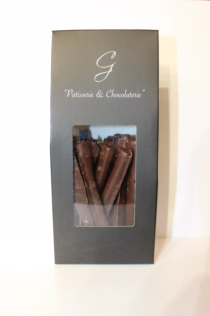 Biscuit noisette Croustillant praliné/fleur de sel Praliné fondant à l’ancienne Mousse chocolat Ganache montée chocolat au lait